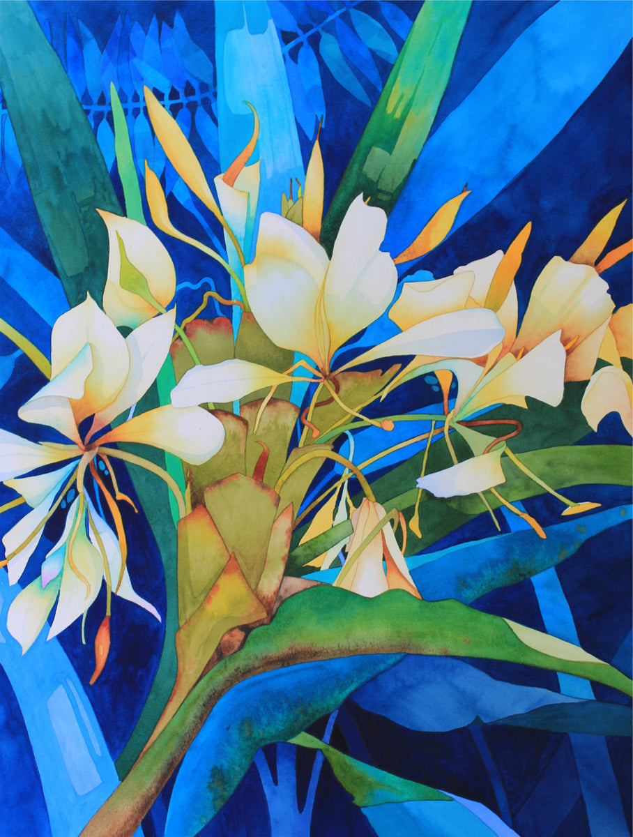 Karin Novak-Neal's art career took off shortly after taking an early retirement from Continental Airlines and moving to Kona, Hawaii. She and her husband opened an art gallery across from the Banyan's beach in Kailua-Kona. Her watercolor style took a bolder, more dramatic step towards abstract after being introduced to the many colorful tropical flowers throughout Hawaii. Karin has solidified herself as a well recognized artist and instructor over her many decades in the art world of Hawaii.
