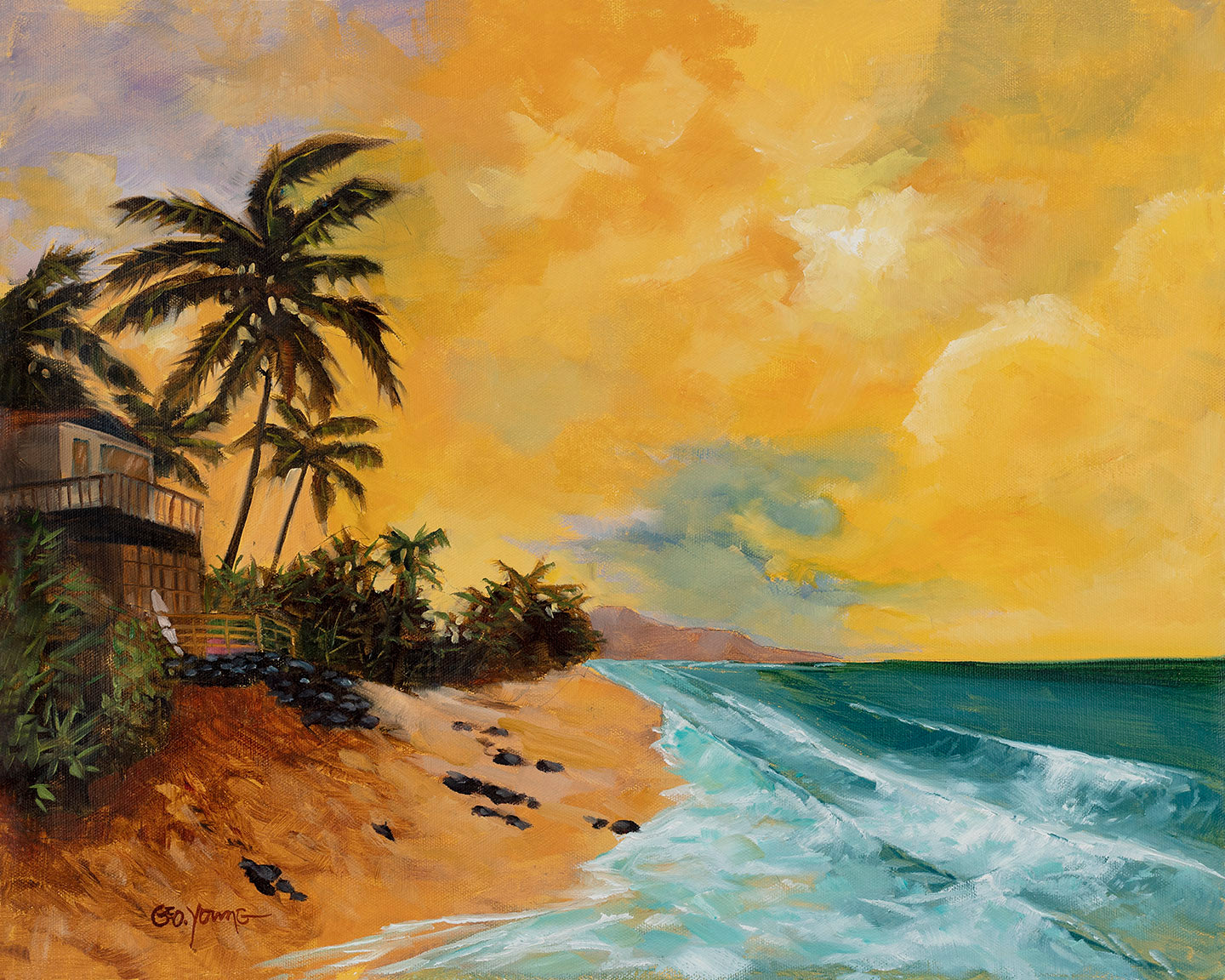 Local artist George Young began studying art and painting under the guidance of his father who was also an artist and teacher. A native of Newport Beach, California, Mr. Young has resided near coastal locations for most of his life and that proximity has cultivated a love of lush ocean landscapes and warm tropical climates. His beautiful oil paintings are primarily images of Maui’s paradise. He skillfully blends vivid color and shadow, and he genuinely captures the languid beauty that his subjects inspire.