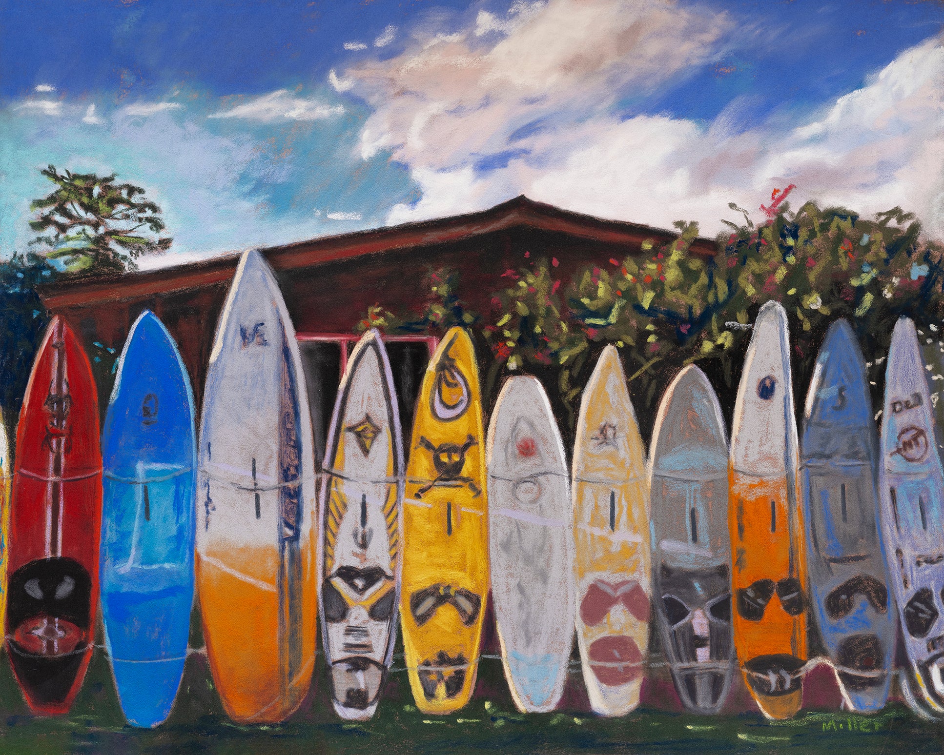 The poet Mary Oliver’s advice on instructions for living a life: “Pay attention. Be astonished. Tell about it.” This is what Laurie Miller believes she was called to do as an artist, to look for the magic in a sunset, a wave crashing, a surfer ready to find the perfect set; to fully experience and be wowed, and then to tell those stories through her artwork. The “why” in her paintings is to reconnect people to their dreams and cherished memories. Adept with oils and pastels she uses them to awaken the senses, and evoke the sentiments of how people want to feel or how they felt about being in a particular place, such as the beautiful island of Maui. What are the colors and textures they envision, what gives them that sense of awe and wonder? Her focus is on the simplicity of her surroundings to artistically express the essence of the moment.