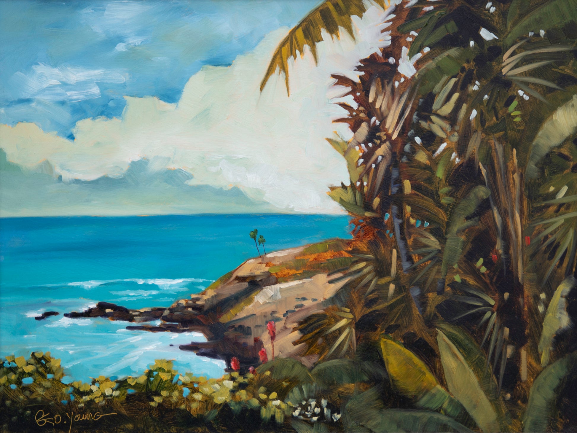 Local artist George Young began studying art and painting under the guidance of his father who was also an artist and teacher. A native of Newport Beach, California, Mr. Young has resided near coastal locations for most of his life and that proximity has cultivated a love of lush ocean landscapes and warm tropical climates. His beautiful oil paintings are primarily images of Maui’s paradise. He skillfully blends vivid color and shadow, and he genuinely captures the languid beauty that his subjects inspire.
