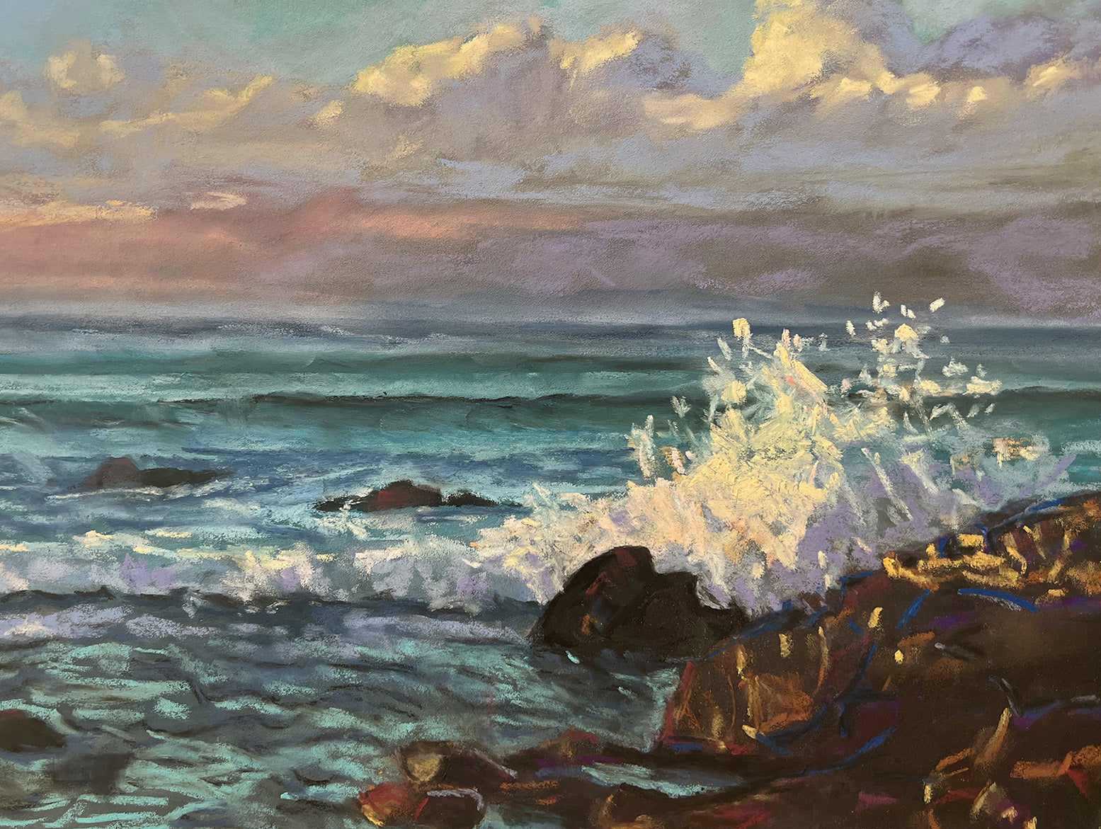 The poet Mary Oliver’s advice on instructions for living a life: “Pay attention. Be astonished. Tell about it.” This is what Laurie Miller believes she was called to do as an artist, to look for the magic in a sunset, a wave crashing, a surfer ready to find the perfect set; to fully experience and be wowed, and then to tell those stories through her artwork. The “why” in her paintings is to reconnect people to their dreams and cherished memories. Adept with oils and pastels she uses them to awaken the senses, and evoke the sentiments of how people want to feel or how they felt about being in a particular place, such as the beautiful island of Maui. What are the colors and textures they envision, what gives them that sense of awe and wonder? Her focus is on the simplicity of her surroundings to artistically express the essence of the moment.